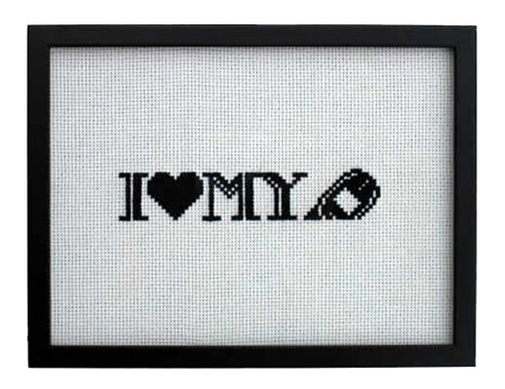 I Love My Mobile 31/05/2004 Hand-stitched mobile phone picture message. 19 x 14.5cm (framed) Aida, black embroidery silk |