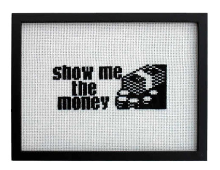 Show Me The Money 31/05/2004 Hand-stitched mobile phone picture message. 19 x 14.5cm (framed) Aida, black embroidery silk |