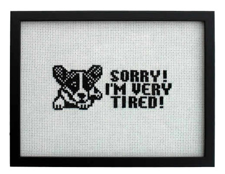 Sorry I am Very Tired 31/05/2004 Hand-stitched mobile phone picture message. 19 x 14.5cm (framed) Aida, black embroidery silk |