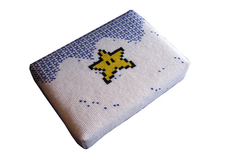 This hand-stitched kneeler was inspired by Starman from Super Mario bros. The design depicts the star among clouds. 36 x 26 x 8cm Penelope canvas, 100% wool tapestry thread, high density foam, calico, hessian, webbing, brass D ring. |