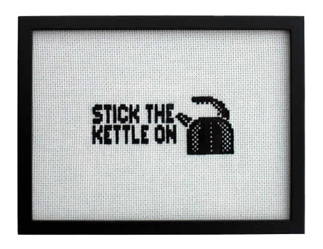 Stick The Kettle On 31/05/2004 Hand-stitched mobile phone picture message. 19 x 14.5cm (framed) Aida, black embroidery silk |